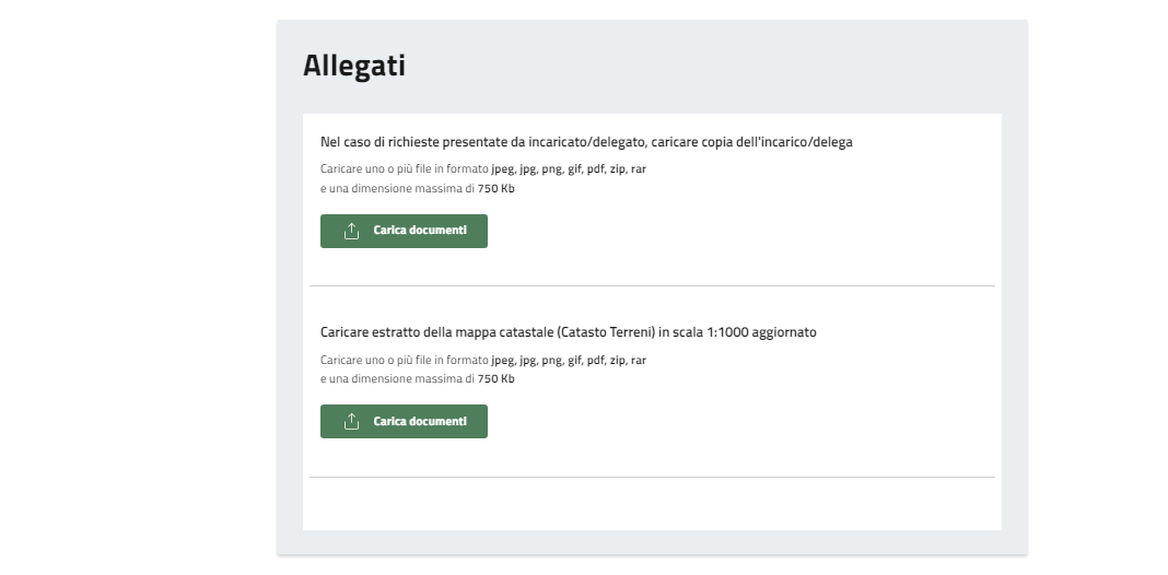Cliccando su "Carica documenti" inserire l'incarico o la delega e della mappa catastale.
