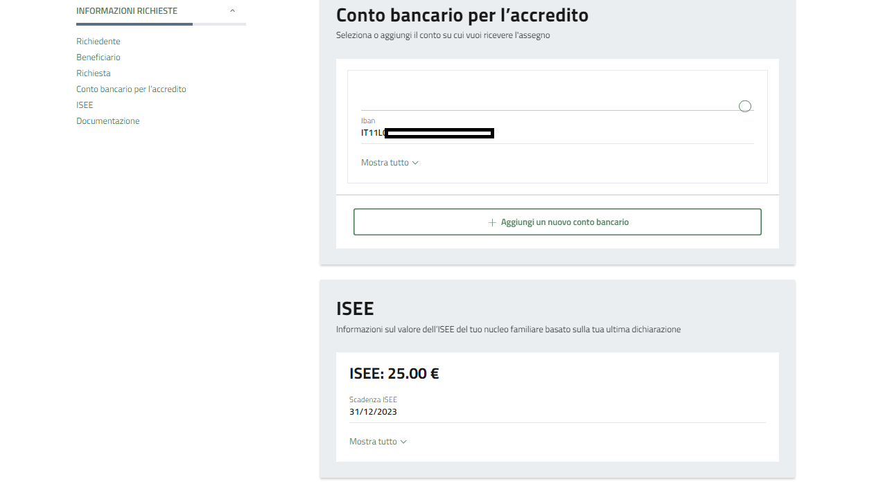 I box "Conto bancario per l'accredito" e "ISEE", nel caso in cui i dati siano stati inseriti nelle Impostazioni, si troveranno gli Iban e i valori ISEE.