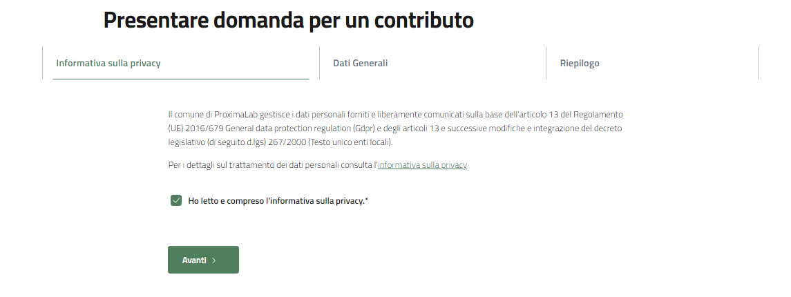 Il primo passo per richiedere un contributo, è l'accettazione dell'informativa privacy.