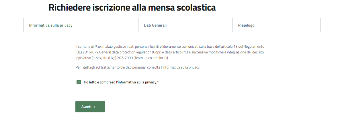Il primo passo per richiedere l'iscrizione alla mensa scolastica, è l'accettazione dell'informativa privacy.