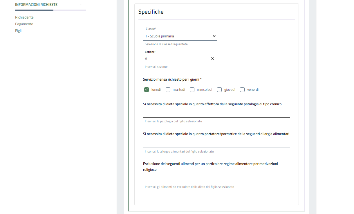 Una volta selezionato il nominativo corretto si devono aggiungere tutte le indicazioni riguardanti la frequenza scolastica e l'eventuale dieta specifica