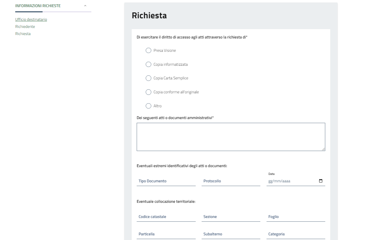 Nel box "Richiesta"  vanno inseriti i dati specifici del/dei documento/i richiesto/i.