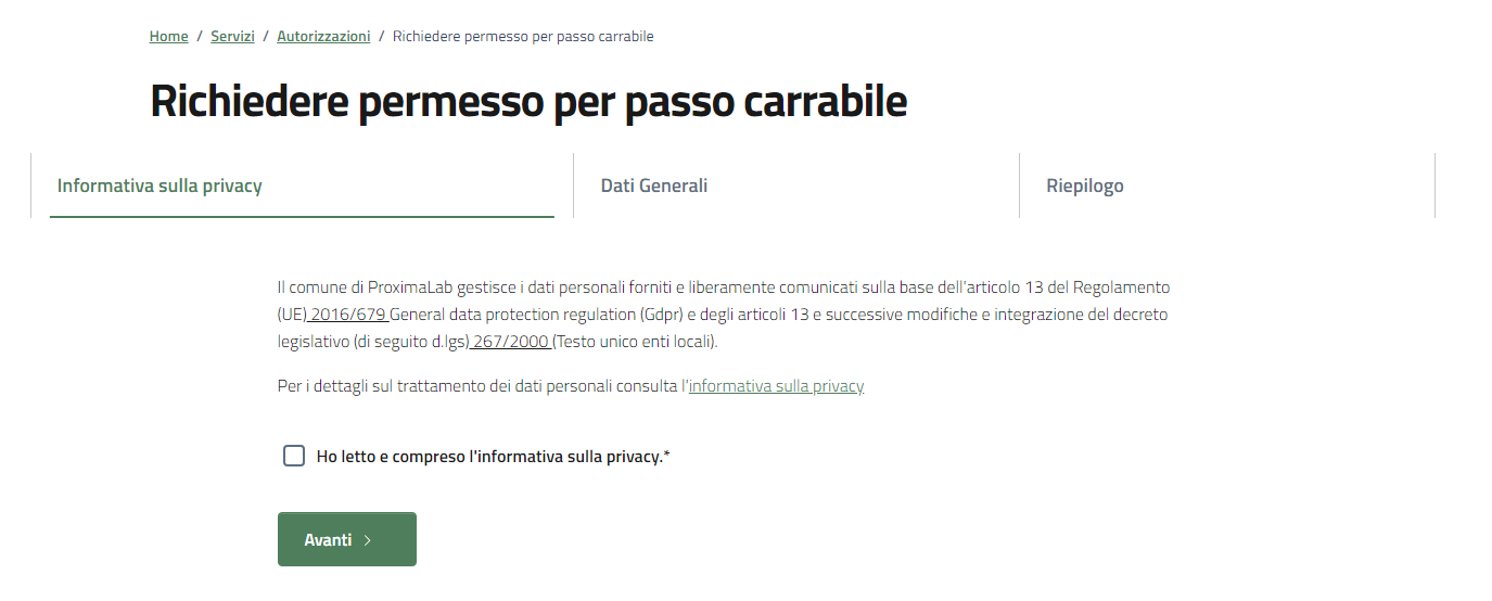Il primo passo per richiedere il permesso per passo carrabile, è l'accettazione dell'informativa privacy.