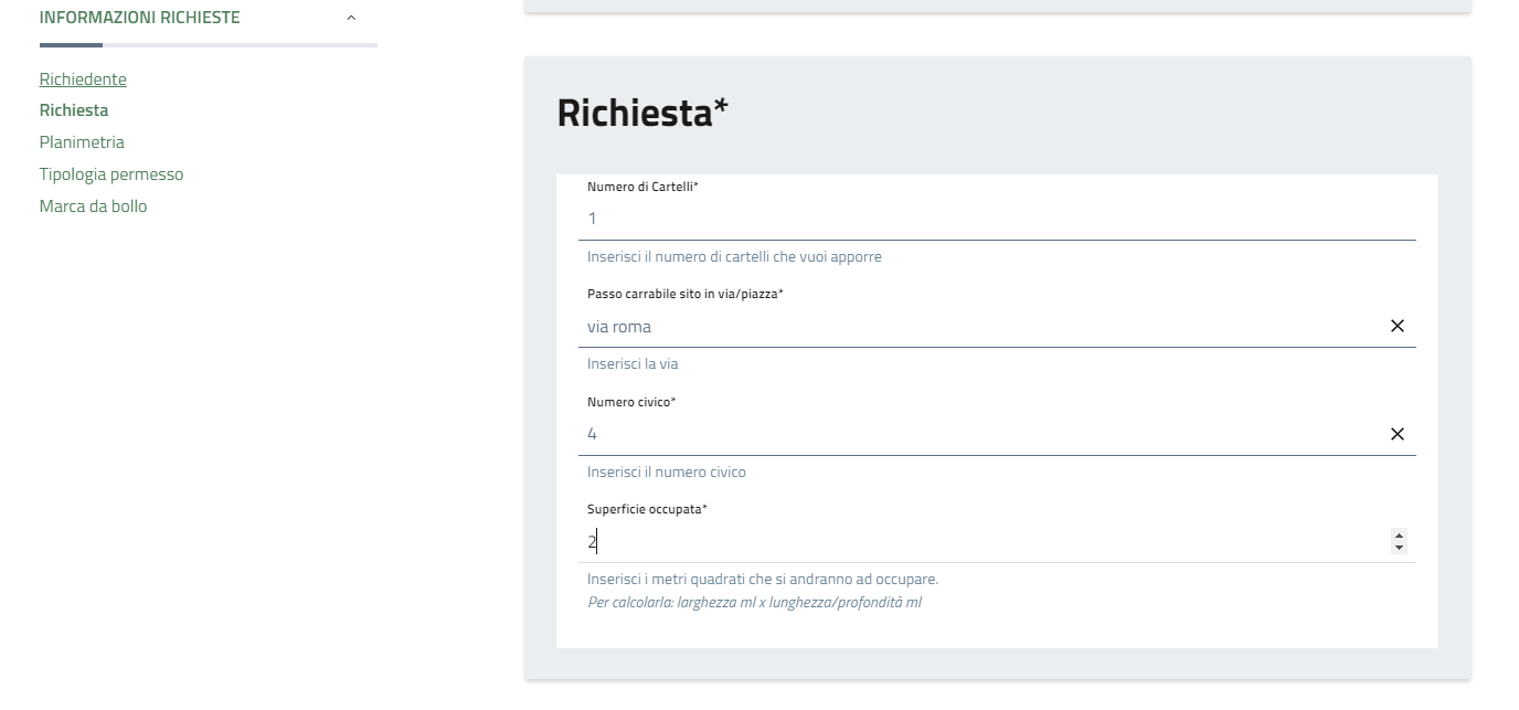 Indicare il numero di cartelli richiesti, il luogo dove si vuole sia installato e la superficie sulla quale non si vuole permettere la sosta